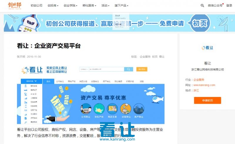 看让平台以公司股权、商标产权、网店、设备、房产等企业资产交易及项目融投资服务为主营业务,解决了行业信息不对称,资源浪费,交易繁琐,服务不到位的行业痛点。